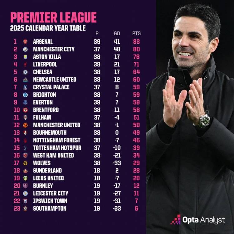• 英超2025年度积分榜:阿森纳领跑曼城第2 曼联未进前十